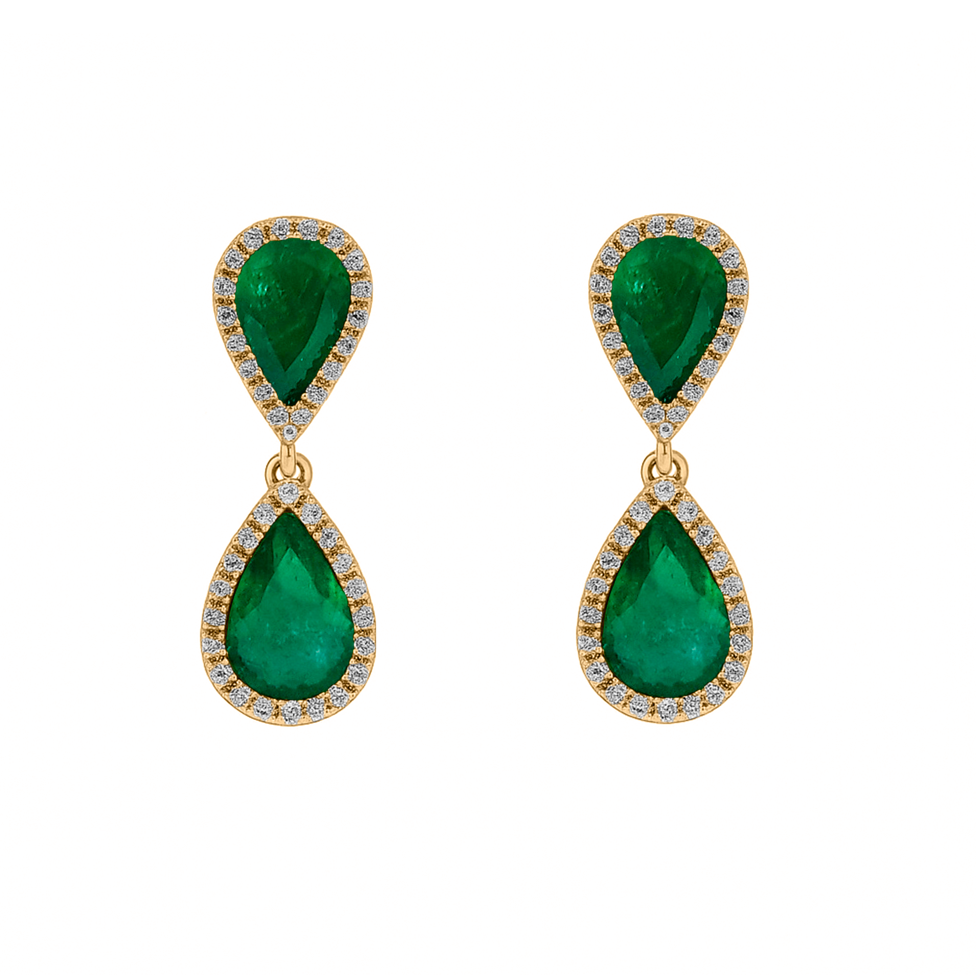 Aretes de Lagrima en Oro Amarillo 18k con Esmeraldas Diamantes
