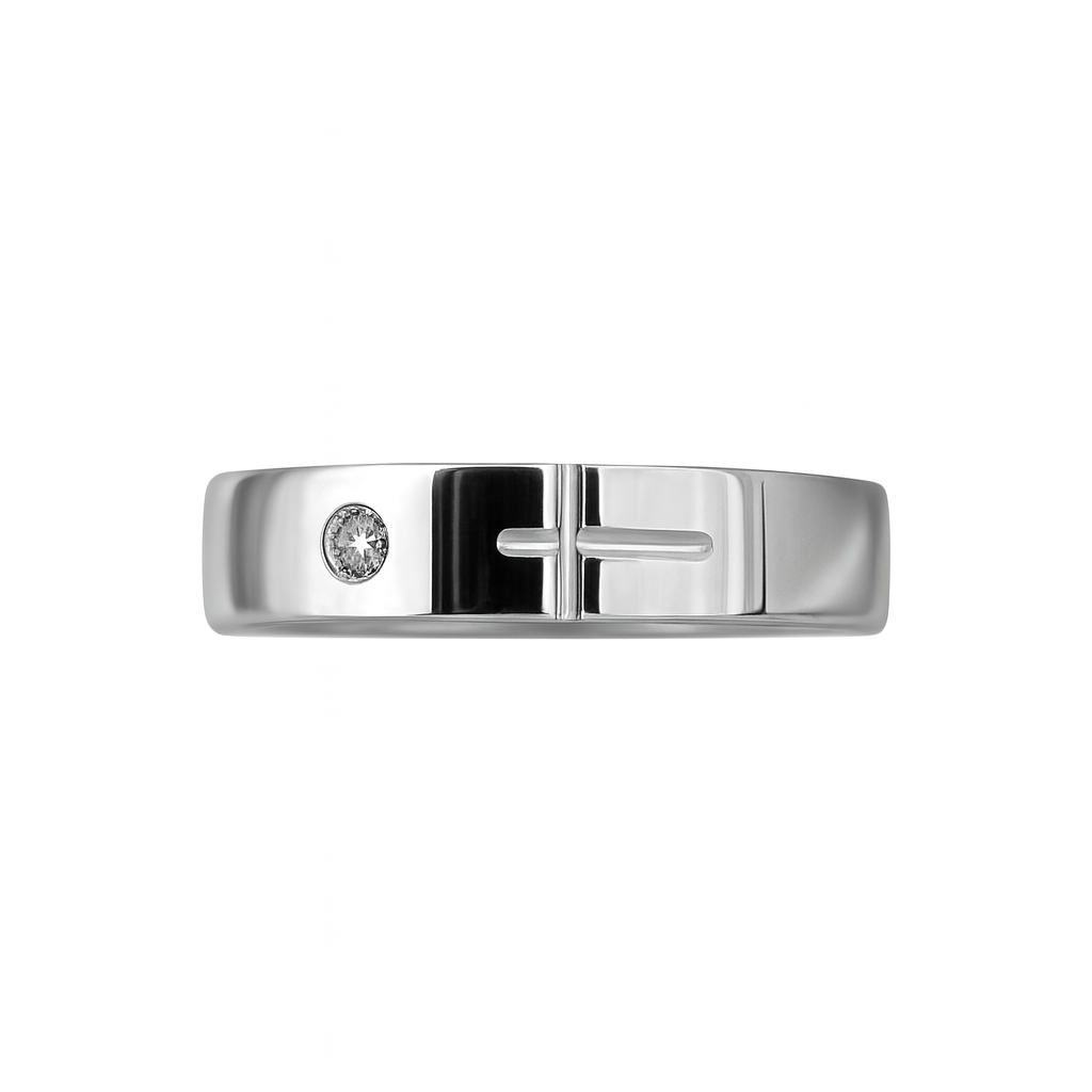 Anillo en plata 950 con un diseño moderno y minimalista que destaca por su circón lateral incrustado y su corte central geométrico, creando un estilo limpio, elegante y contemporáneo. Su acabado brillante tipo espejo aporta un aspecto refinado y sutil, ideal para uso diario, compromiso, regalo especial o como argolla con diseño discreto y distintivo.
