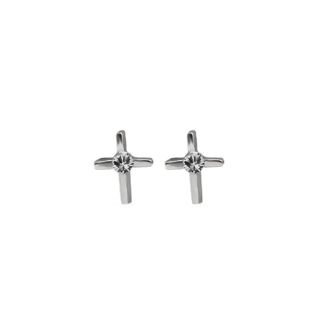 Características: Aretes cruces con circón en talla redonda ,en oro blanco de 18 k con sistema de rosca de seguridad.