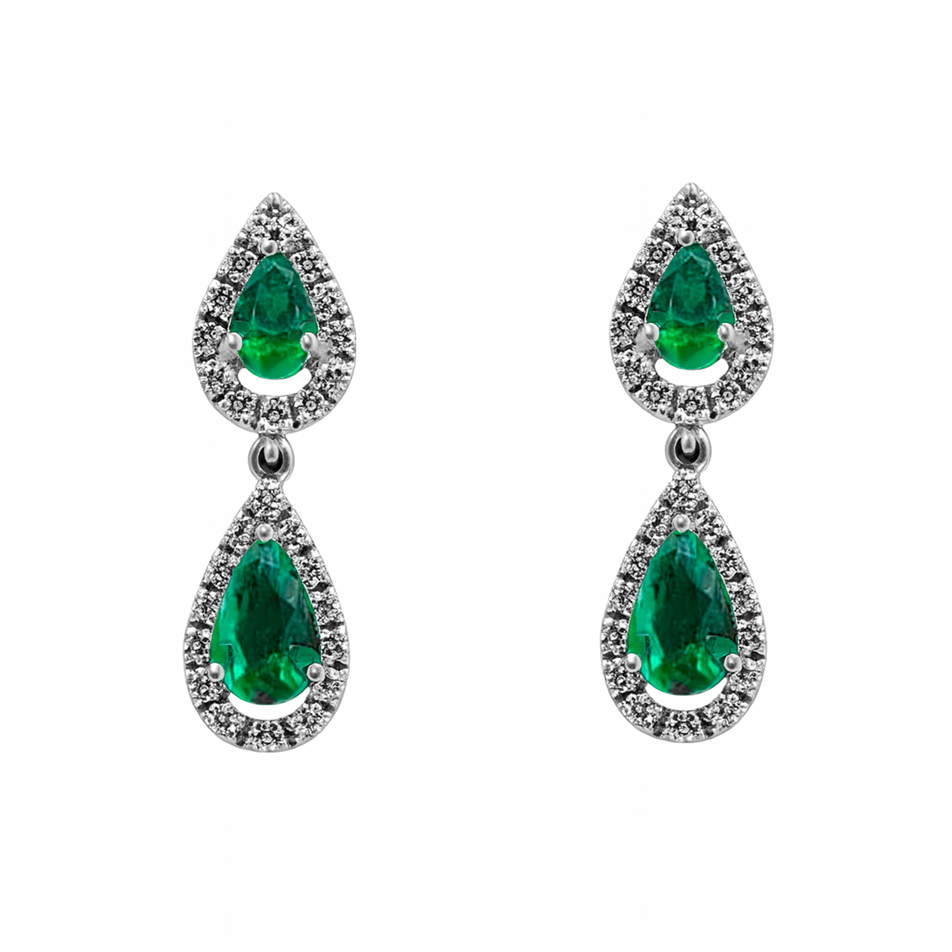 Aretes de Gotas en Oro Blanco 18k con Diamantes y Esmeraldas