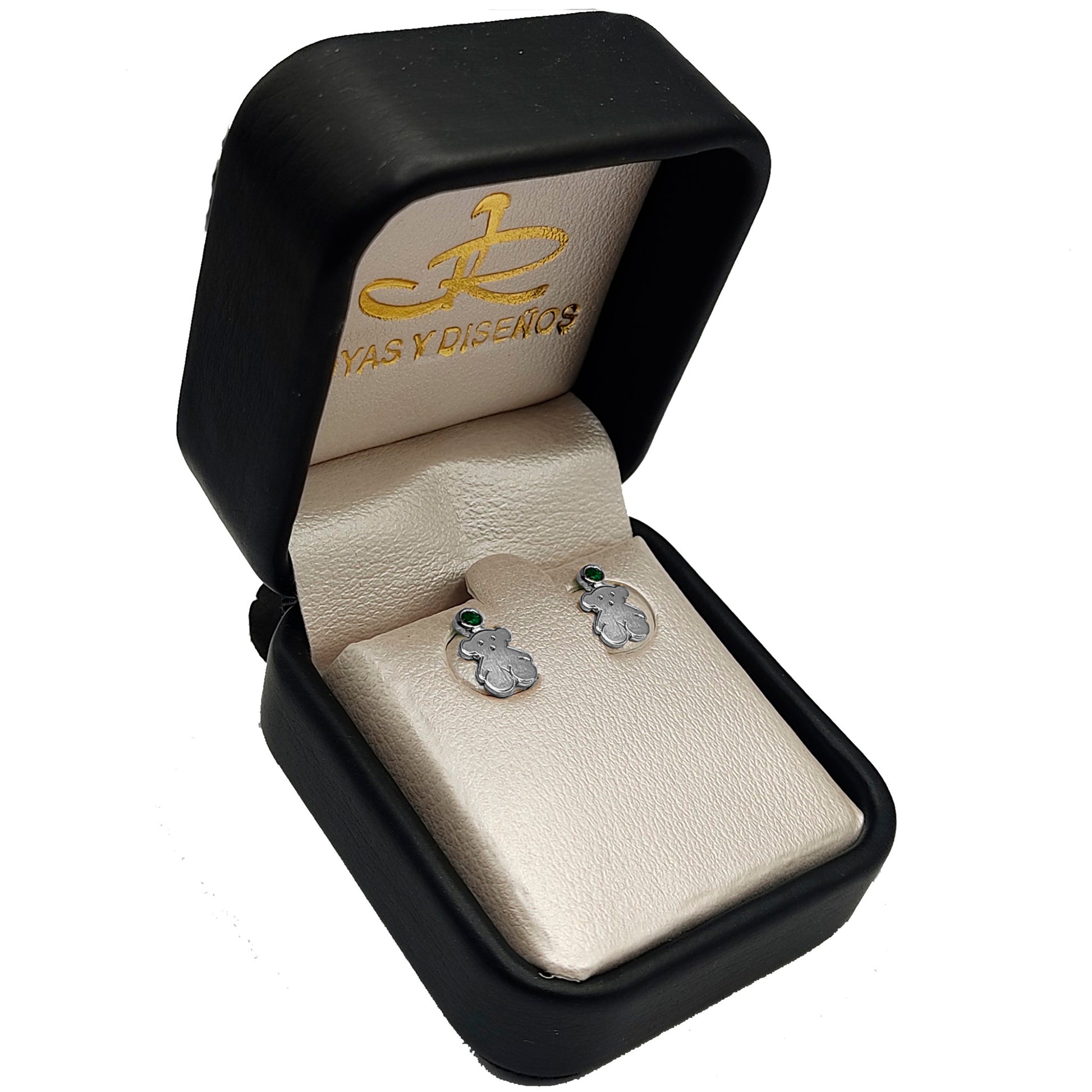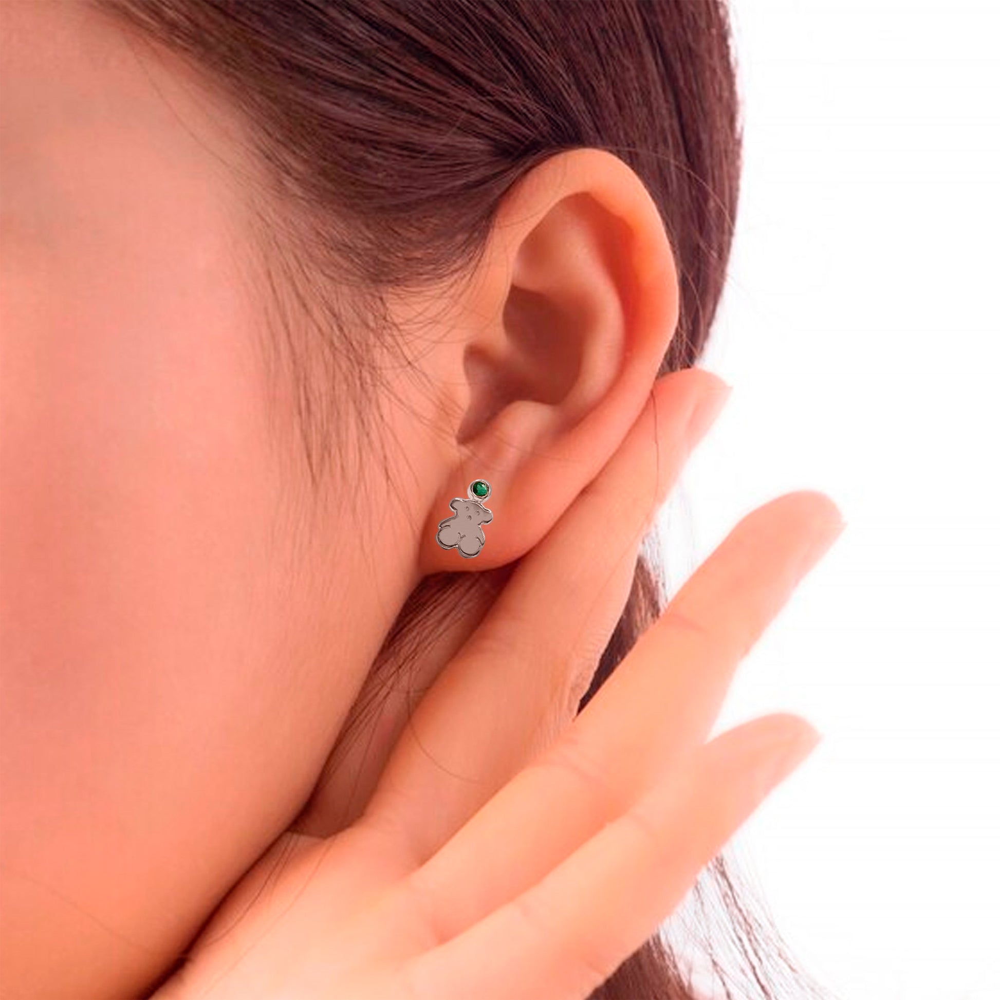 Características: Aretes topos con opción de escoger la gema de su preferencia entre: esmeralda, zafiro, amatista o circón de corte redonda, el topo es modelo oso ,en oro blanco de 18 k con sistema de rosca de seguridad.